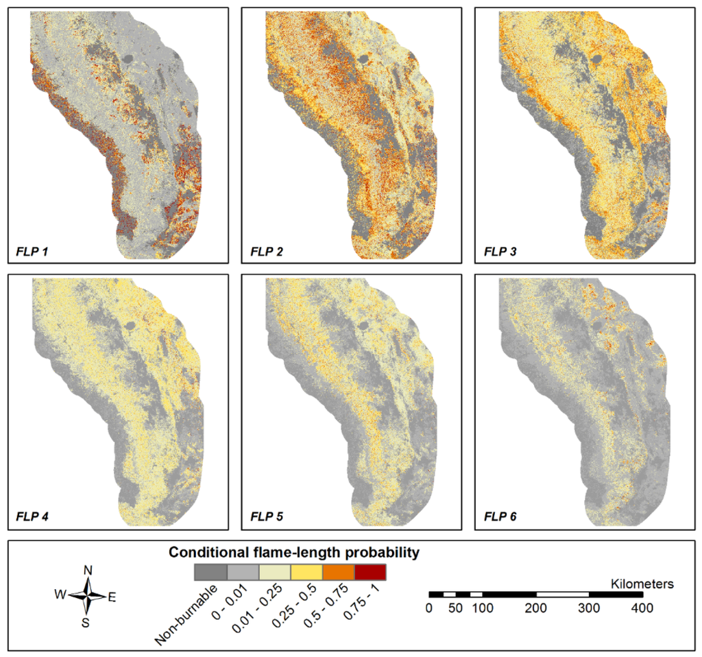 Conditional flame length probabilities (FLPs) for each of the six flame length classes for the Southern Sierra Risk Assessment landscape.