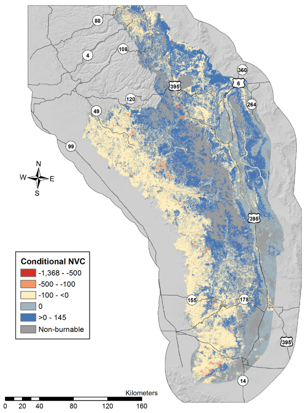 Figure 8 shows cNVC results across the assessment area, with beneficial effects shown in blue and negative effects in warmer colors like orange and red. Much of the timber fuel in the middle of the assessment area and the shrub fuel along the northeastern portion experience positive conditional fire outcomes—should a fire occur—while the majority of the western portion of the assessment area resulted in negative outcomes. Positive fire effects are largely attributable to beneficial responses for certain BpS models where fire had the desired effect of creating a distribution of SClass categories more representative of desired conditions. Conversely, negative values seen along the western portion of the assessment area represent negative outcomes to watersheds, human habitation and infrastructure, slightly reduced by some positive outcomes due to vegetation. At first glance, it appears there are more beneficial effects on the landscape than there are negative. However, the overall mean cNVC value for the landscape is slightly negative at −0.57. Pixel values of negative outcomes range from less than zero to −1368 while positive outcomes have a max value of 145. Although there are relatively few areas of orange and red pixels, their values could be up to nine times the value of a beneficial outcome.