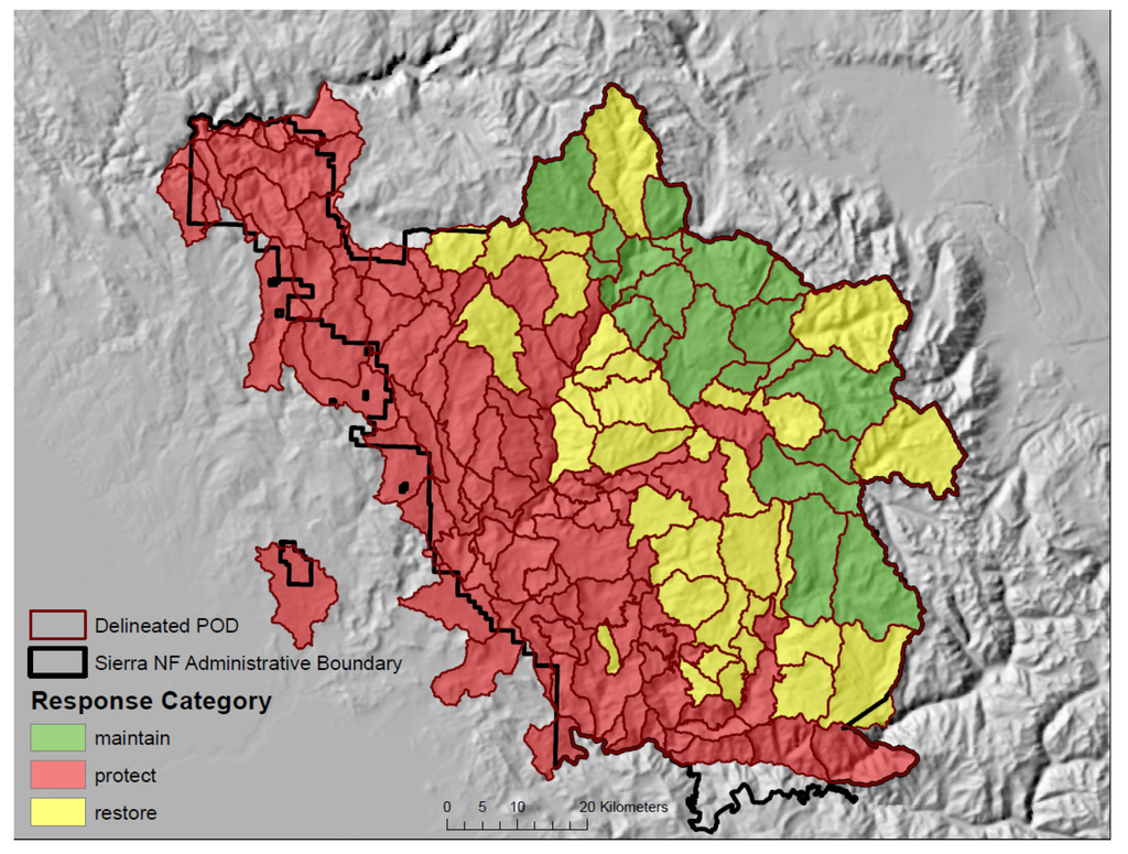 To demonstrate, we drill down and use a set of 147 PODs selected according to the criteria of having at least 10% of the area within the administrative boundaries of the Sierra National Forest, exclusive of the Great Sequoia National Monument. We developed these POD boundaries using a process patterned after one implemented by the local fuels planner on the Inyo National Forest (part of the SSRA). Reflective of landscape heterogeneity, PODS varied in size and shape, with a mean size of 4281 ha, and a median size of 3069 ha, which roughly corresponds to 2–3 PODs per 6th level sub-watershed. Note that the PODs we use here for purposes of demonstration may be updated by the Forests in the future, i.e., POD boundaries are not necessarily a finished product. In fact, as a design feature POD boundaries should be flexible, for instance in response to significant fuel changes after a large disturbance event.