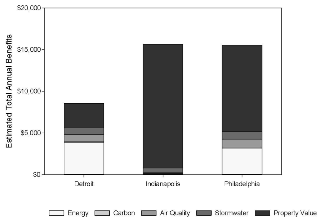 Property value benefits were the predominant benefit type in Indianapolis and Philadelphia, while energy benefits predominated in Detroit (Figure 2). Ninety-five percent of estimated annual benefits in Indianapolis were property value benefits because property value increase is the predominant benefit type in the Lower Midwest climate zone i-Tree models.