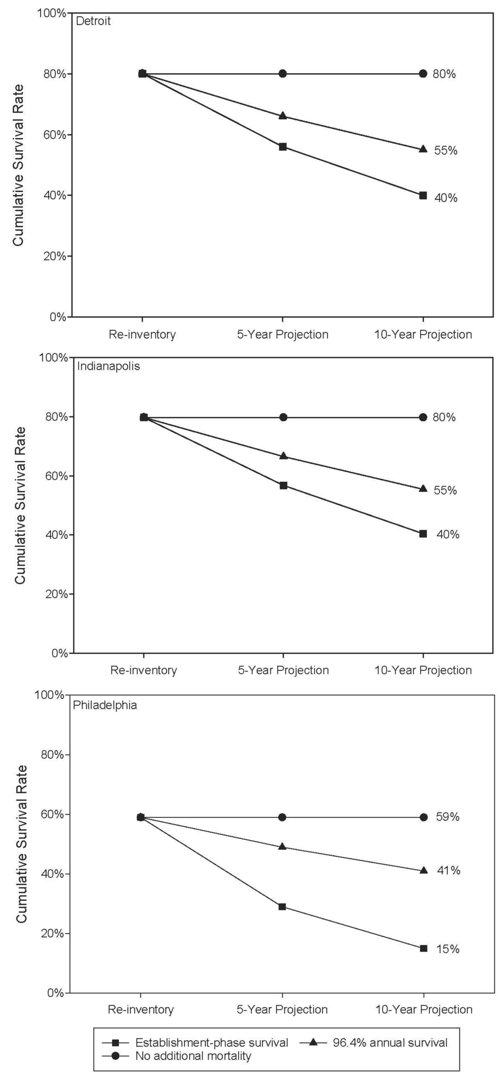 The three different annual survival scenarios result in different proportions of trees remaining in the sample population 5 and 10 years in the future (Figure 3). With continued establishment-phase annual survival of 93% in Detroit and Indianapolis, only 40% of the planted trees in those cities will be alive in 10 years, compared to 80% of planted trees alive in 10 years with no additional mortality. With continued establishment-phase annual survival of 87% in Philadelphia, only 29% of planted trees will be alive in 5 years and only 15% will be alive in 10 years, compared to 59% of planted trees alive in 10 years with no additional mortality.