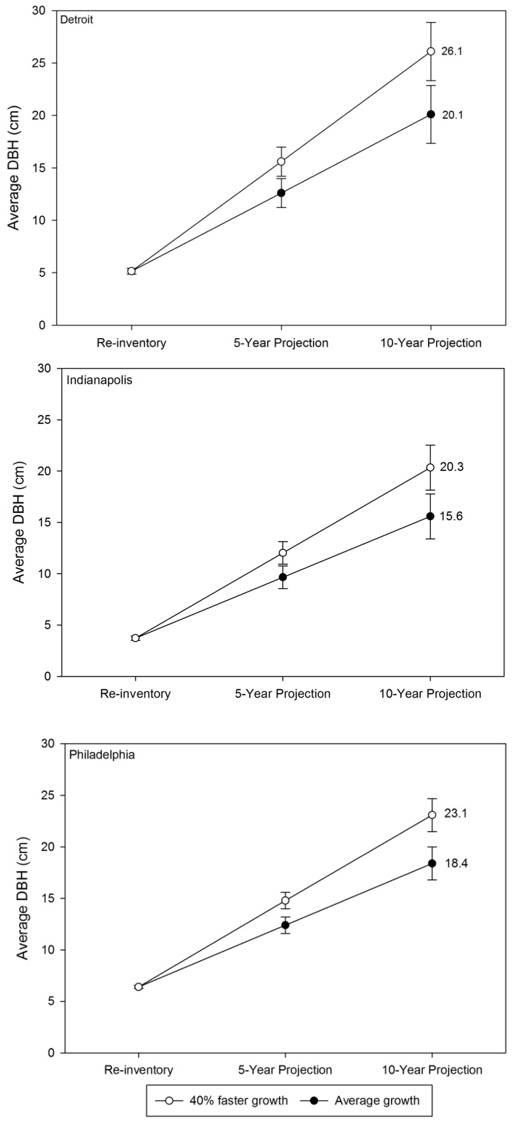 The two different growth scenarios (average vs. 40% faster growth) resulted in different average DBHs 5 and 10 years in the future (Figure 4). For each study city, the difference between the two growth rates is an approximately 2.5 cm difference in average DBH after 5 years and an approximately 5 cm difference in average DBH after 10 years.