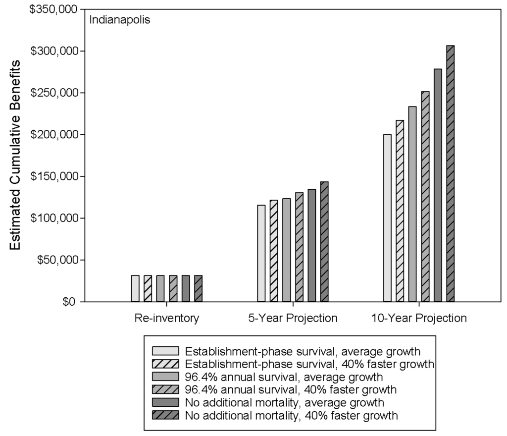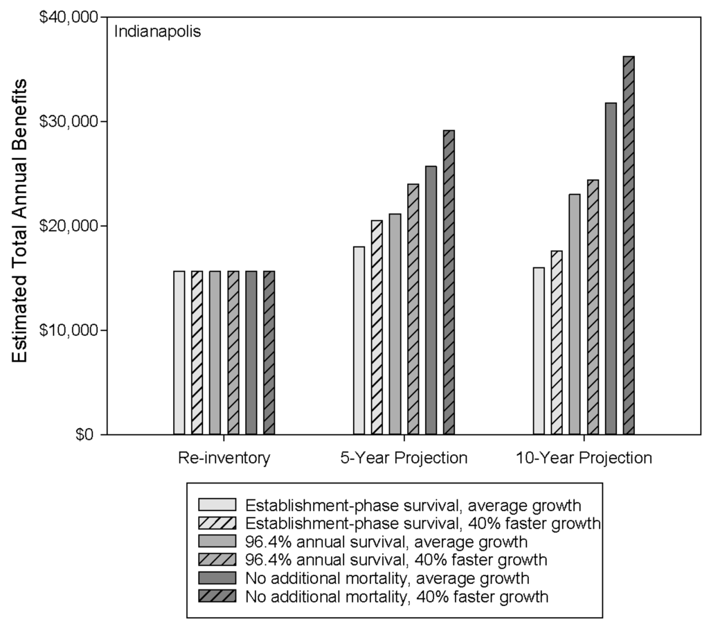If the tree populations maintain the establishment-phase annual survival rates and the average growth rates continue, high tree mortality results in fewer trees conferring benefits; thus, the projected populations in Indianapolis and Philadelphia provide fewer benefits in the future (Figure 5). However, if the tree populations maintain an annual survival rate of 96.4%, the total annual benefits provided by the trees can be expected to increase over the next 10 years. If no more trees die, the total annual benefits provided by the tree populations can be expected to double in the next 10 years (Figure 5).