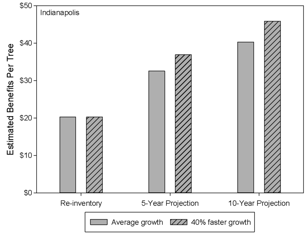 Estimated annual benefits per tree in Indianapolis at the time of re-inventory and projected 5 and 10 years into the future with average growth and 40% faster growth.