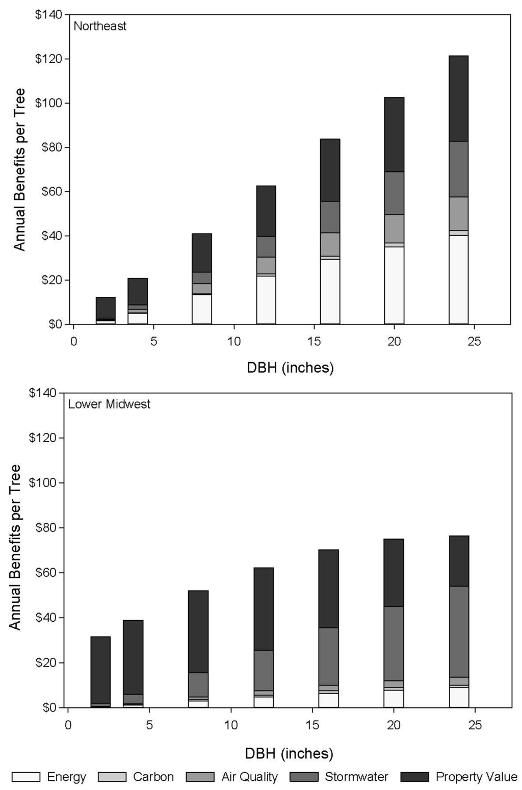 The i-Tree regional community tree guides estimate the average costs per tree, assuming a 40-year lifetime, to be $34/year for a large public tree in the Northeast [9] and $24/year for a large public tree in the Lower Midwest [8]. Using these estimated annual costs, the average annual benefits (Table 10) exceed average annual costs (i.e., net annual benefits are positive) after 13–15 years of growth (the 10-year projection) in Detroit and Philadelphia and after 8–10 years of growth (the 5-year projection) in Indianapolis.