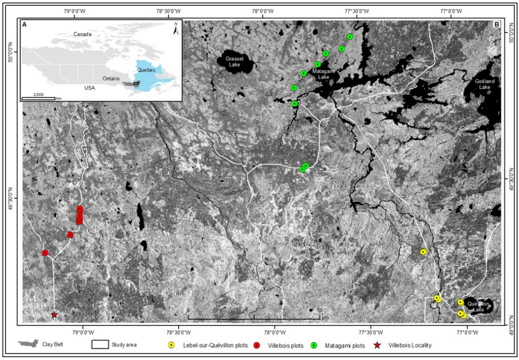 (A) study area in the Clay Belt region; (B) sampling plots sites along three locations Matagami (green dots), Lebel-sur-Quévillon (yellow dots), and Villebois (red dots) on a black and white Landsat satellite image that covers the investigated area.
