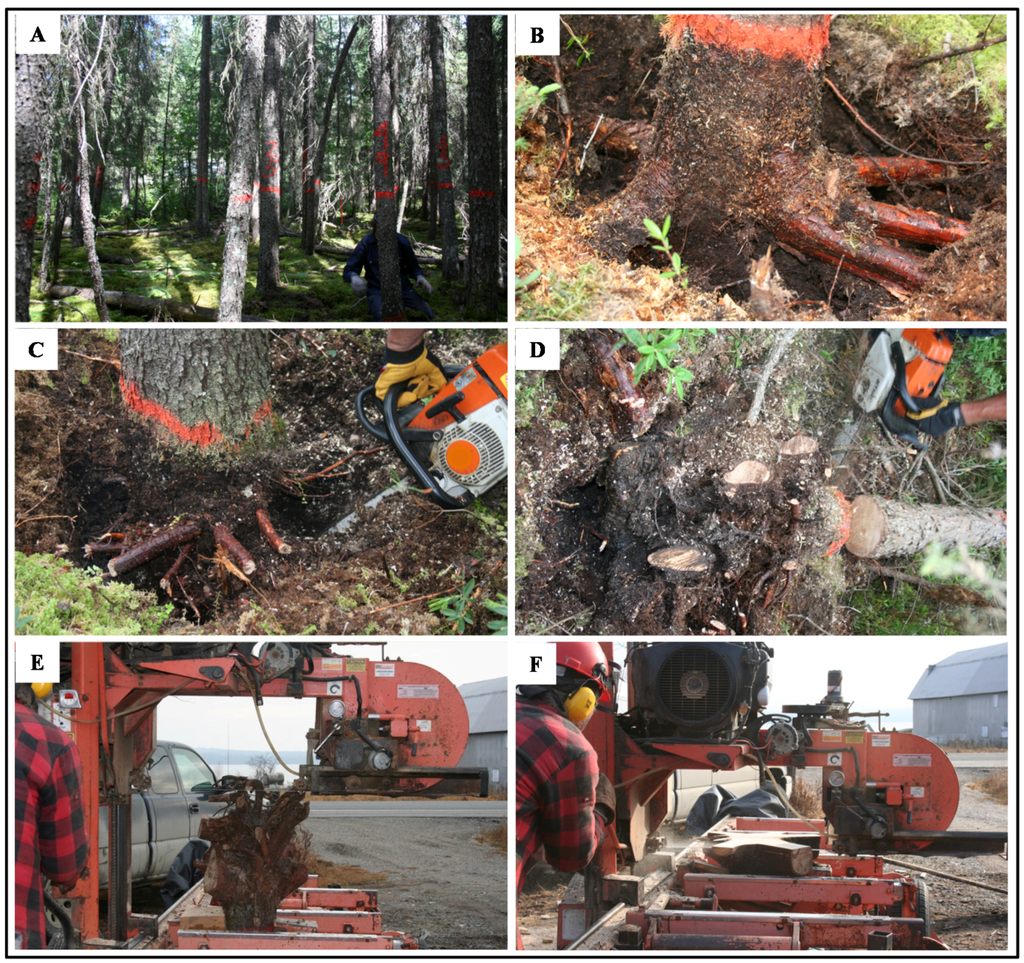 In each plot, a set of vegetation variables were recorded following forest inventory guidelines of the Quebec Ministry of Natural Resources (MRNQ; [34]). Diameter at breast height (DBH, 1.3 m), status (alive or dead), and species were recorded for each tree with a diameter >9 cm. Subsets of three live black spruce trees (dominant and co-dominant trees) per plot were selected for age and total height measurement (Figure 2A). Tree selection was done in such way that the first tree was chosen among the four largest living trees of each plot; the second was chosen to be representative of the average DBH tree recorded within each plot; and the third was selected from all the listed trees within each plot using the quadratic mean, which was calculated by dividing the total number of trees in each plot by two. The result was then rounded to the nearest whole number and was considered the rank of the tree. A total of 81 selected trees were cut down with a chain saw in a way that the stump was lifted out of the ground by the weight of the falling stem by first cutting off the main lateral roots that provide most of the structural support (Figure 2B,C) and pushing down on the stem (Figure 2D). Total height (m) of each selected tree was then measured using a tape measure.