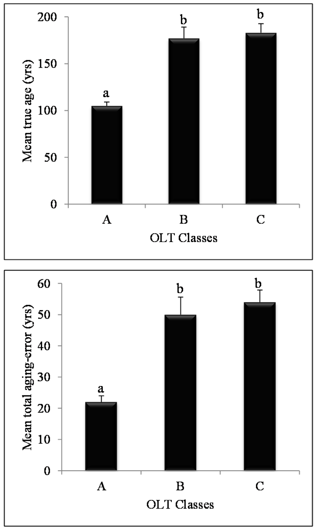Mean age underestimations from this study (22, 50, and 54 years for OLT classes A, B, and C, respectively) are much greater than age corrections proposed by [22] as standard correction factors (one to seven years, in richest to poorest sites, respectively) for the province of Quebec. These values were estimated from the average time that seedlings reach 1 m height in a plantation (sapling method; [17]). However, this method does not consider the fact that the development of adventitious roots at the base of trees [8] with the accumulation of organic matter with time and/or paludification, growth rings (years) that are concealed in the stump wood of mature trees [7,41] must also be added. When the age of trees is then used to estimate productivity (SI; Site Index), such a gap between true age and estimated age may lead to grossly biased forest management decisions [15] and misinterpretation of stand dynamics [17]. Since annual allowable cuts are based on how long trees take to grow to a certain size [22], age underestimation automatically leads to overestimation of available volumes in the future and overexploitation of the resource. Uncorrected mean tree age is thus a misleading indicator of ecological and economical sustainability [15].
