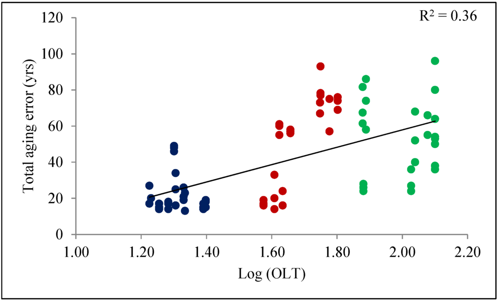 Relationship between total aging error and organic layer thickness. Blue, red and green dots represent OLT classes A, B, and C, respectively.