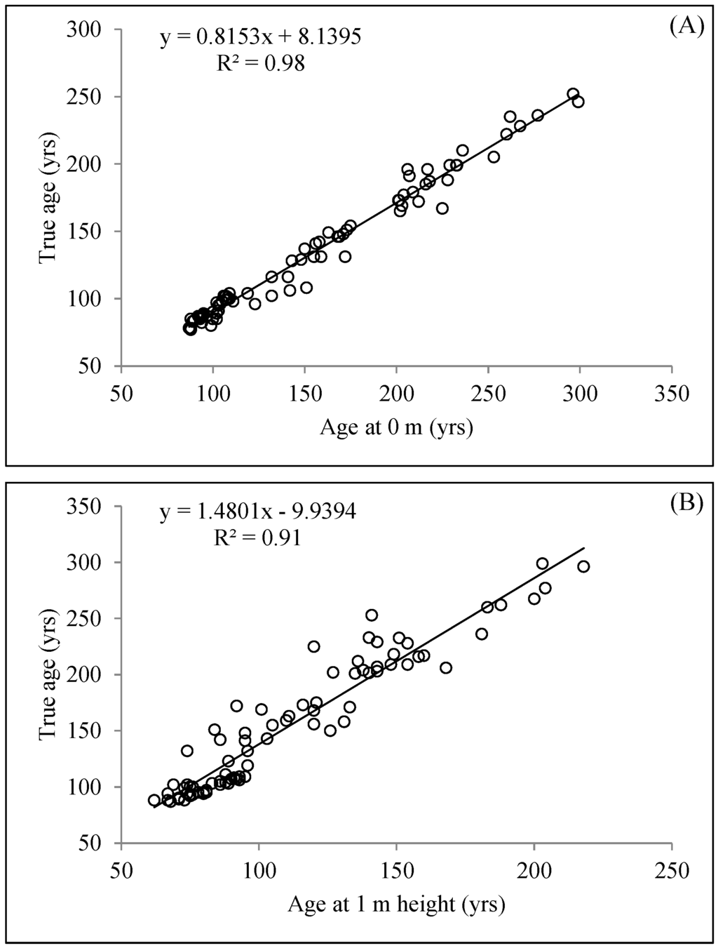 Relationship between true age (root collar age) and ages obtained at 0 m (A) and at 1 m (B) tree height. R-squared values and equations are displayed on each graph.