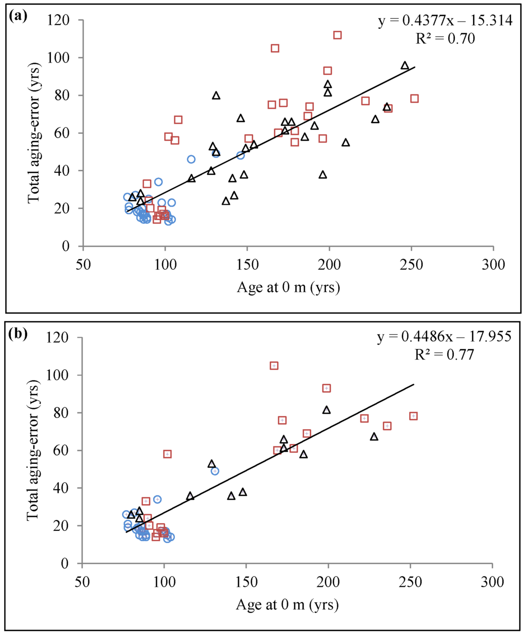 Relationship between total aging error and age at 0 m with (a) all sampled trees (n = 81) and (b) only trees with root collar present (n = 51). Blue circle, red square, and black triangle symbols represent data belonging to OLT classes A, B, and C (representing the three paludification classes), respectively.