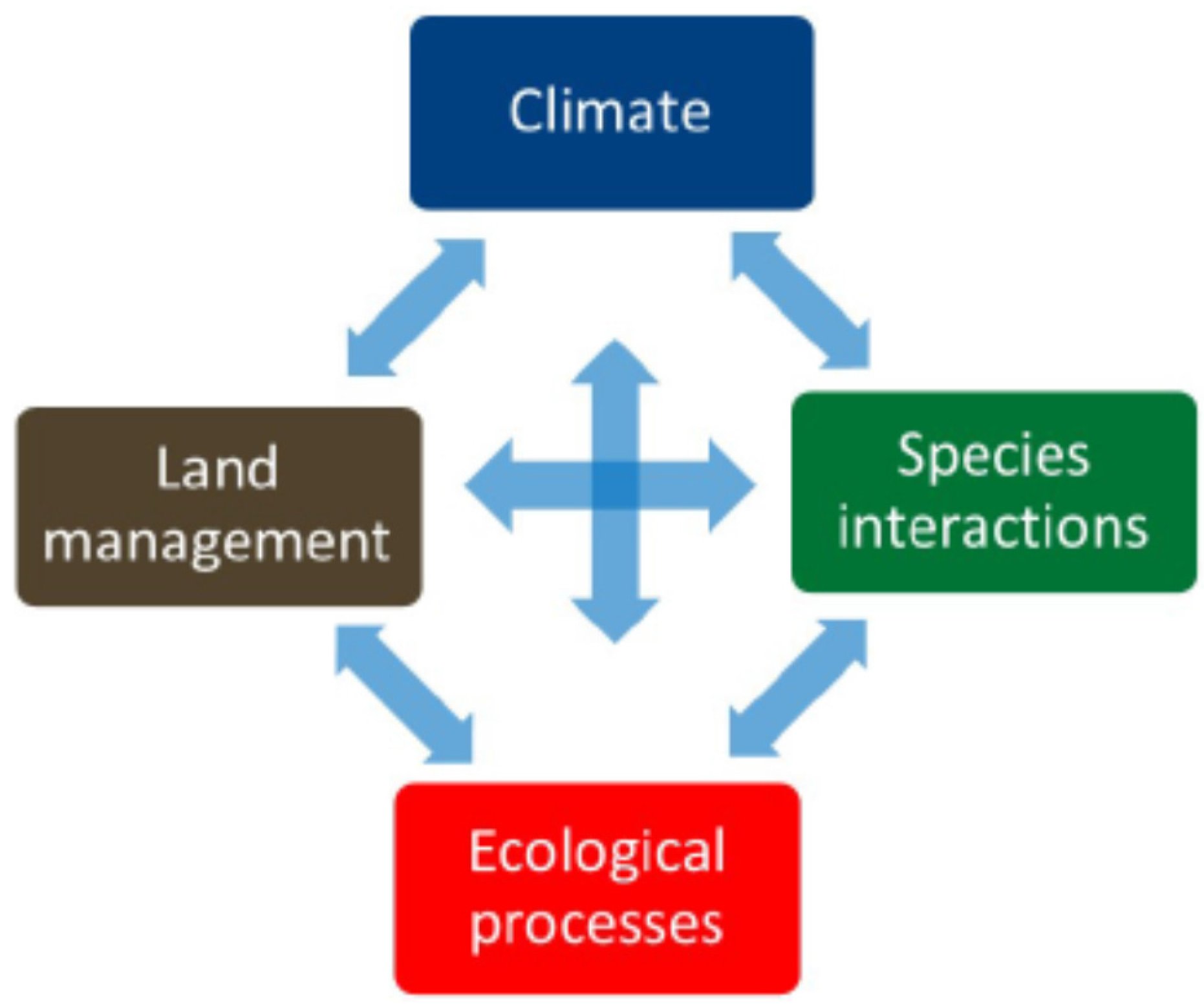 Refugia have attracted attention as important conservation areas [4,15], however the full range of conservation threats in these areas, including wildfire, have not been fully explored. Keppel and Wardell-Johnson (2012) highlight how refugia play a potentially important role in climate buffering and may offer in situ conservation benefits in the face of climate change and its biological effects [4]. We expand ‘climate change and its biological effects’ to explicitly include ecological processes such as fire. In addition, we consider the importance of land management practices because of how policies, such as fire suppression, have drastically changed fire frequency and severity patterns in many forests [16]. Climate, species interactions, ecological processes, and land management combine to create conservation challenges and opportunities for individual refugia (Figure 1).