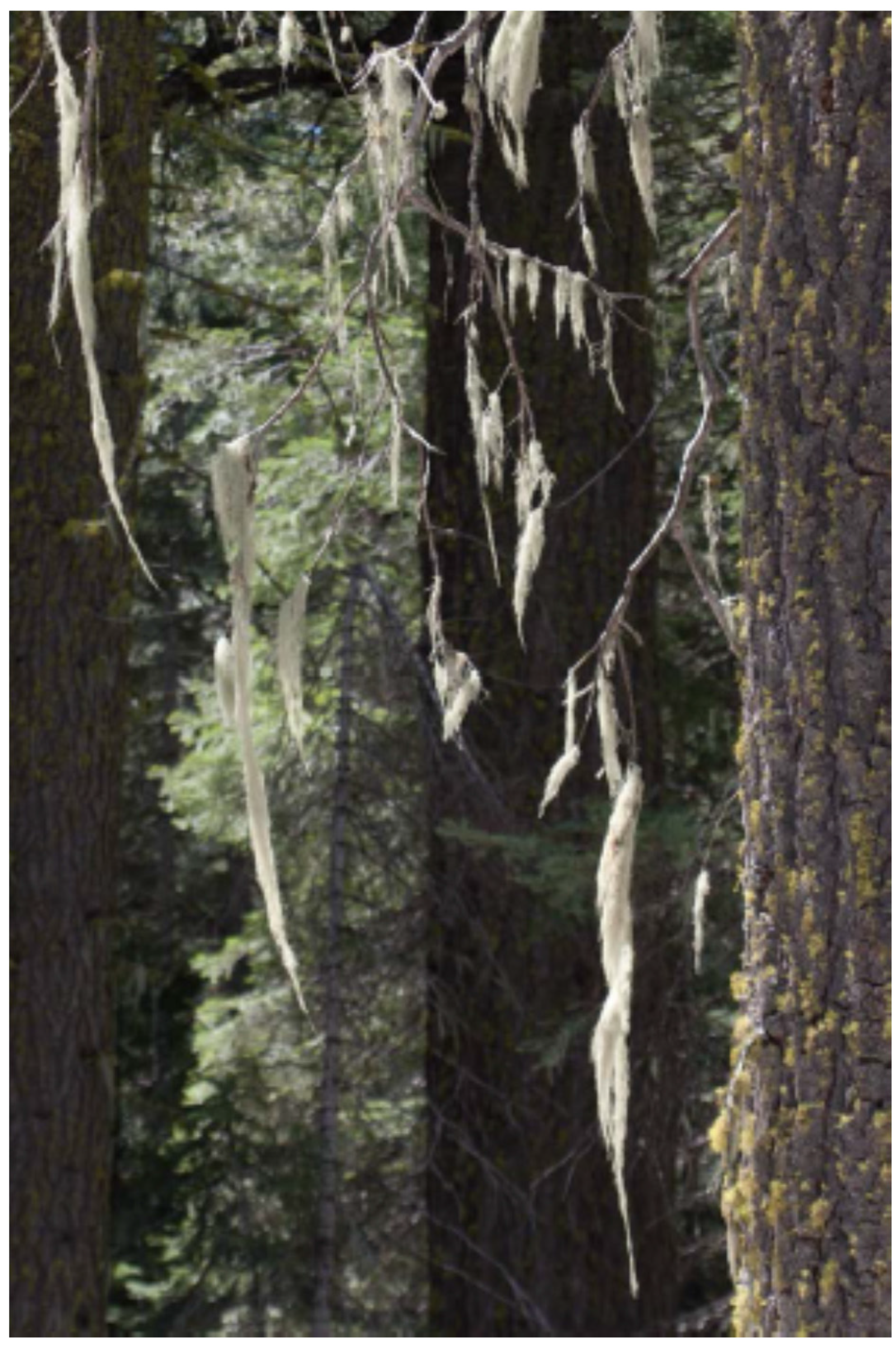 Refugia where species retreated to after the last ice age, such as regions of Yosemite National Park’s Merced Giant Sequoia Grove, have cooler climates with disjunct species characteristic of the Pacific Northwest such as Alectoria sarmentosa (Witch’s hair lichen) pictured here. Yosemite National Park has used prescribed fires to protect areas from large, nearly unstoppable fires such as the catastrophic Rim Fire in 2013. Photo by Martin Hutten.
