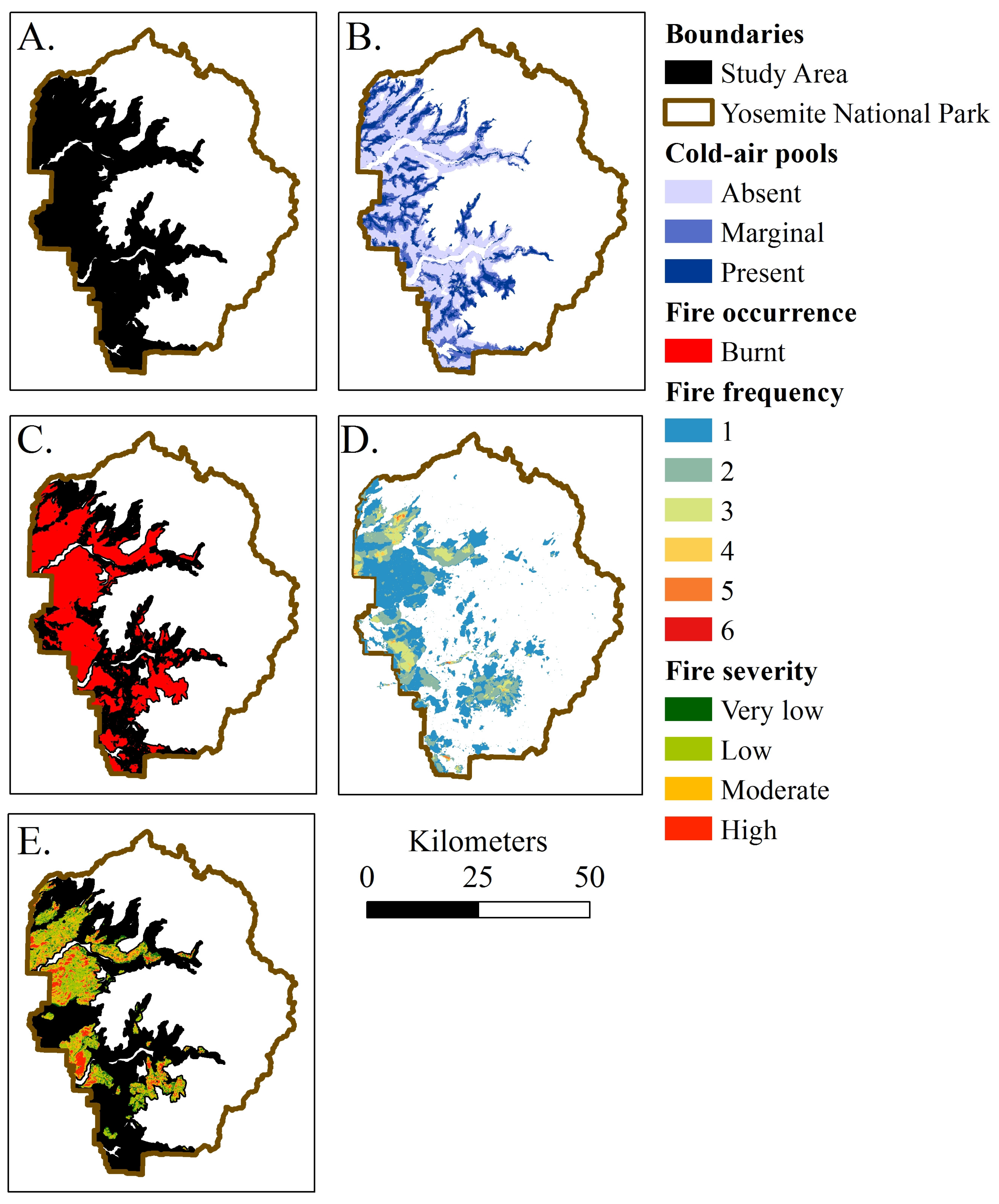 (A) The study area included mixed conifer forests of Yosemite National Park from 1000 to 3600 m in elevation, which encompassed about 170,000 ha; (B) Predicted cold-air pools (CAPs) followed drainages and had a semi-regular pattern throughout the study area. The study area was dominated by areas without CAPs (100,000 ha) followed by areas with marginal CAPs (40,000 ha), and lastly CAPs (30,000 ha); (C) Fires have occurred through about 60% study area from 1930 to 2012; (D) Areas within the study area have burnt up to 6 times; (E) Fire severity distribution from 1984 to 2012 was dominated by low severity followed by moderate severity fires. Fire severity area included: very low severity 16,000 ha, low severity 44,000 ha, moderate severity 28,000 ha, and high severity 12,000 ha.