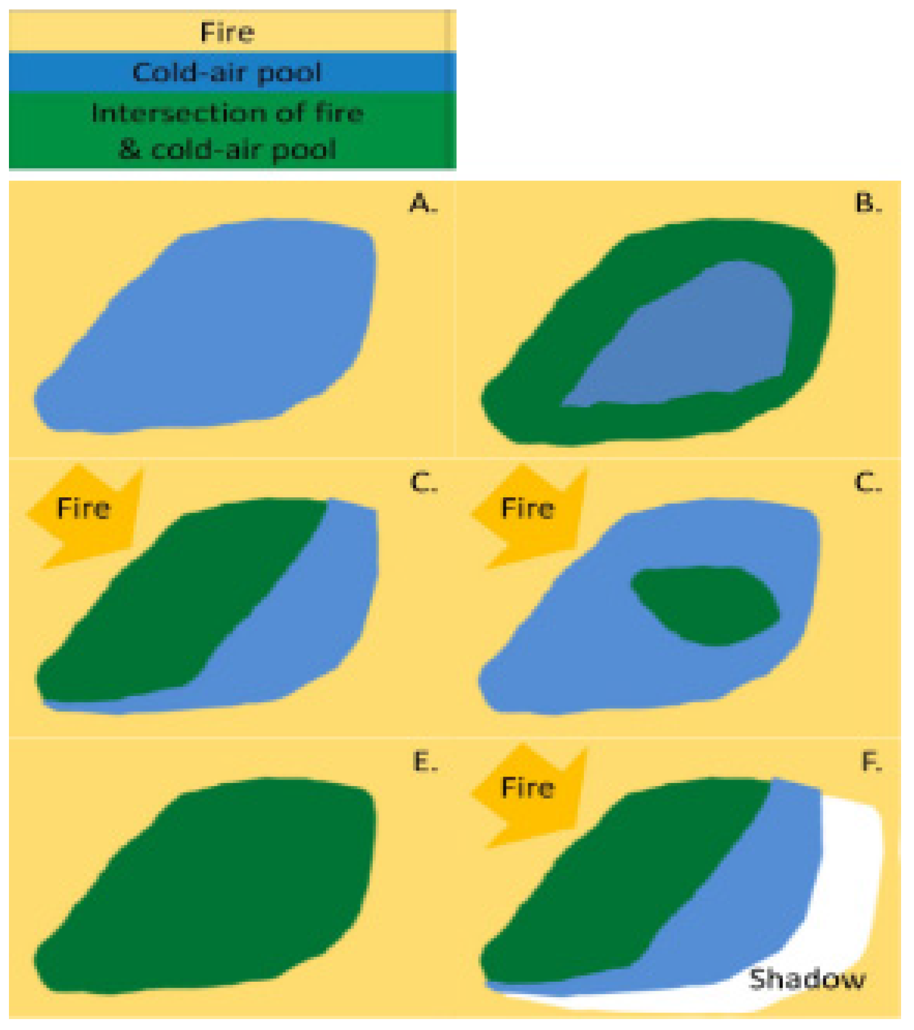 The interaction of fire and CAPs may be dependent upon fire behavior including the fire’s direction, magnitude, and intensity. The yellow background indicates where fire occurred and the golden arrows indicate the fire’s direction of movement. (A) Fires which move slowly (low magnitude) and release little energy (low intensity) may respond quickly to a refugium’s microenvironment and not penetrate the CAP, whereas (B) fires with high magnitude and intensity may respond slowly to a CAP (burn a buffer around the perimeter); (C) and/or a larger region near the flame front; (D) create a spot fire ignites within the CAP which grows especially during dry windy conditions; or (E) can burn the entire CAP. (F) There also may be a CAP fire shadow where a reduction in fire extent or severity occurs because of its proximity to a CAP and the subsequent reduction in fire presence or severity.