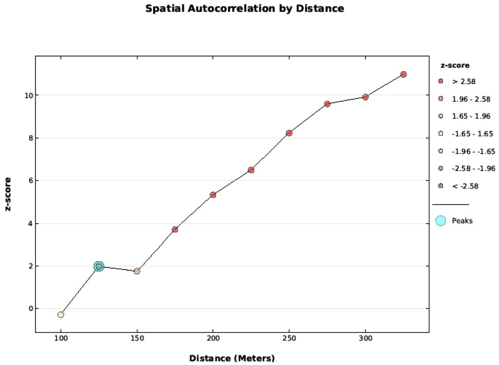 Cold-air pool data was tested with the Global Moran’s I applied to Incremental Spatial Autocorrelation starting at 100 m and increasing at 50 m intervals. The data was not spatially auto correlated at 100 m, but became correlated by 125 m and beyond.