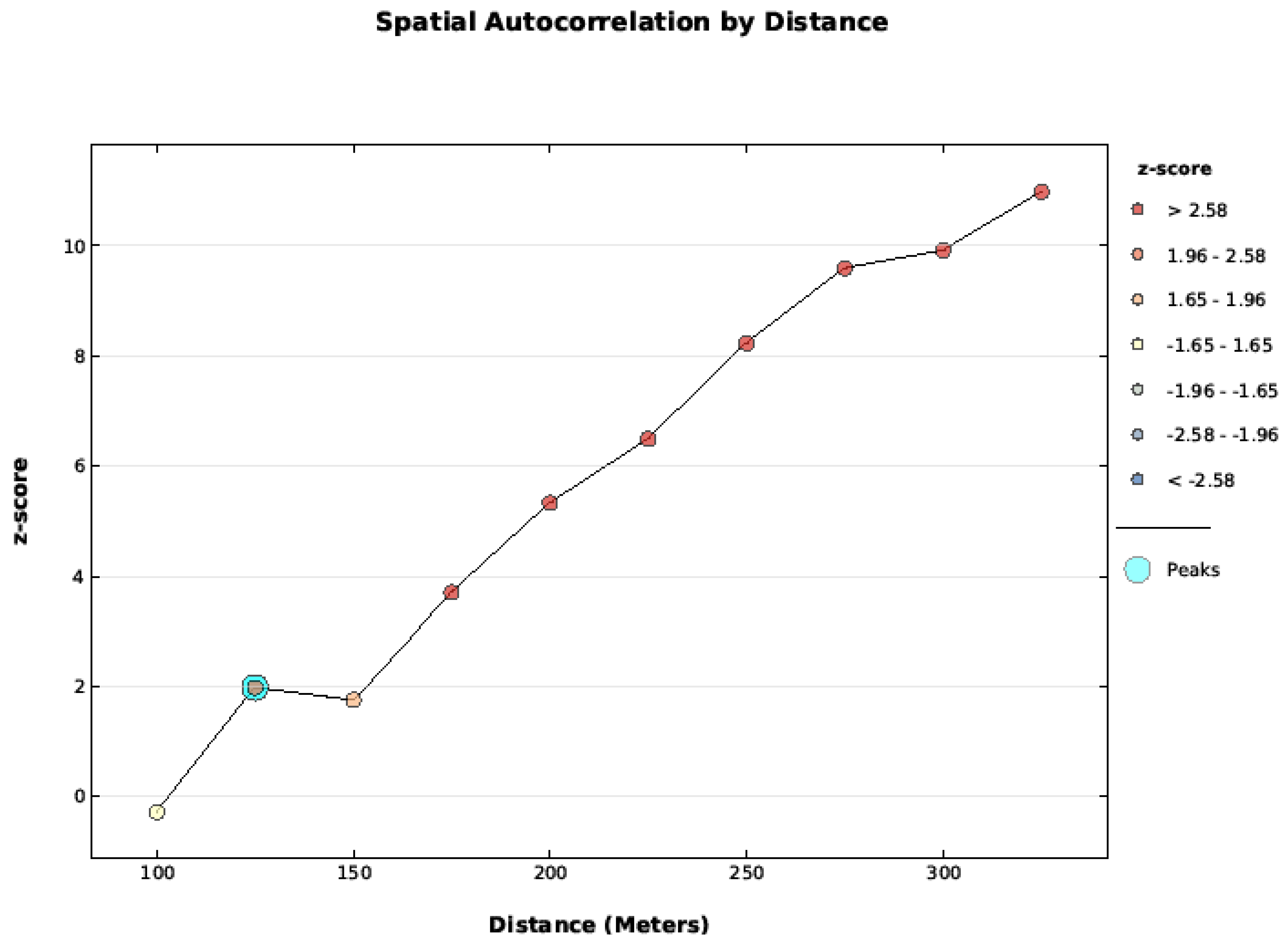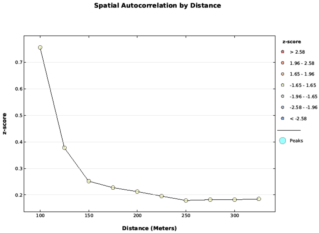 Fire frequency data was tested with the Global Moran’s I applied to Incremental Spatial Autocorrelation starting at 100 m and increasing at 50 m intervals. The data was not spatially auto correlated at 100 m, but become increasingly correlated as distance increased.