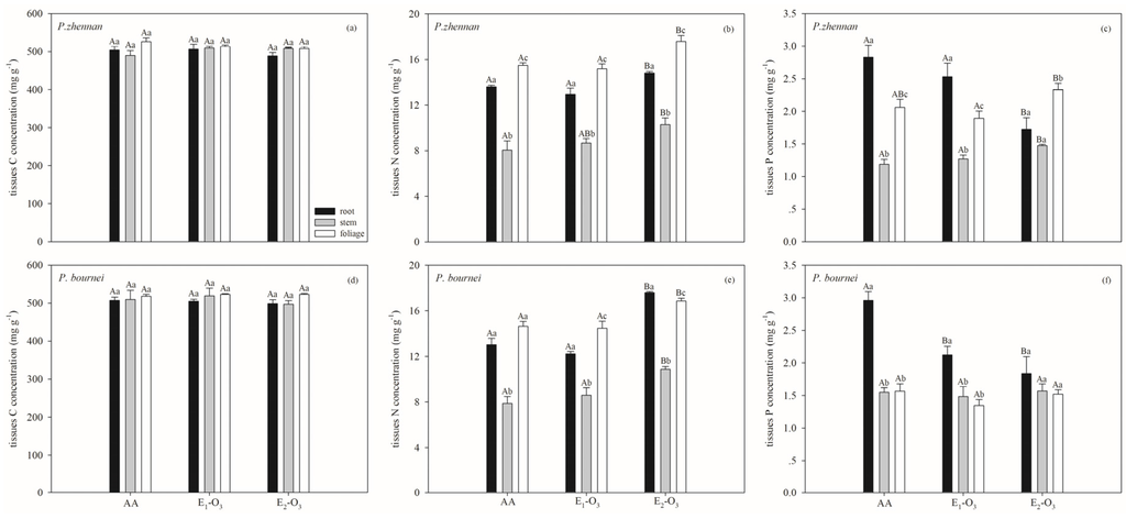 The C, N, and P concentrations of individual tissues of P. zhennan and P. bournei under different O3 fumigation treatments. Different capital letters indicate a significant difference between O3 fumigation treatments for the same tree tissues (p < 0.05), and different lower-case letters indicate a significant difference between different tree tissues within the same O3 fumigation treatments (p < 0.05).