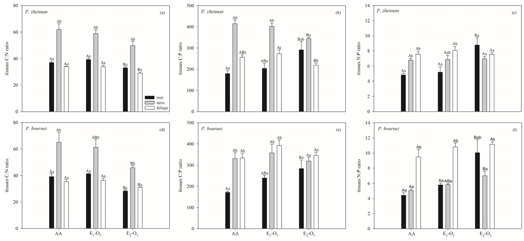 The C, N, and P stoichiometric ratios of individual tissues of P. zhennan and P. bournei under different O3 fumigation treatments. Different capital letters indicate a significant difference between O3 fumigation treatments for the same tree tissues (p < 0.05), and different lower-case letters indicate a significant difference between different tree tissues within the same O3 fumigation treatments (p < 0.05).