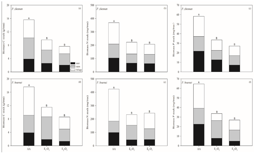 The C, N, and P stocks of individual tissues of P. zhennan and P. bournei under different O3 fumigation treatments. Different capital letters indicate a significant difference between O3 fumigation treatments for the same total biomass nutrient stocks (p < 0.05).