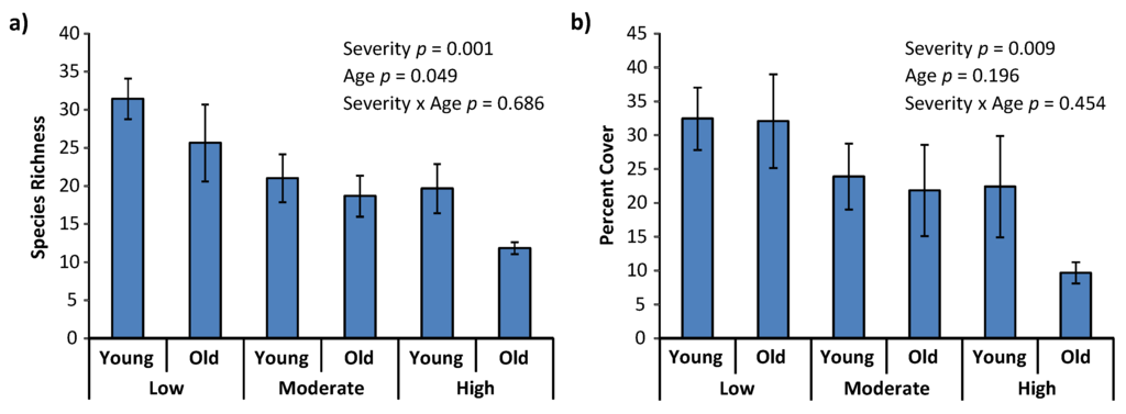 There was a total of 95 plant (including lichen) species (Appendix A) found across all stands with the most numerous species group being lichens with 32 different species found followed by forbs with 31 species found. Stand-level species richness decreased with burn severity and pre-fire stand age (Figure 2a), such that the greatest richness was found in young stands with low burn severity, and the lowest richness was found in old stands with high burn severity. Vascular plant richness, when considered separately, showed no significant differences among burn severity (p = 0.885) or age classes (p = 0.537). Average stand level total plant cover ranged from 4%–63% and also decreased with burn severity, but was not affected by pre-fire stand age (Figure 2b).