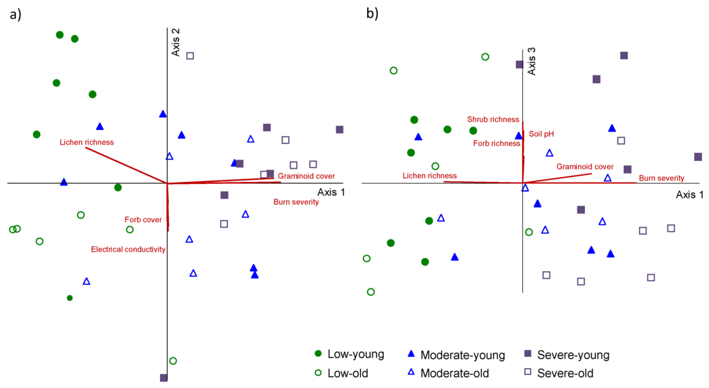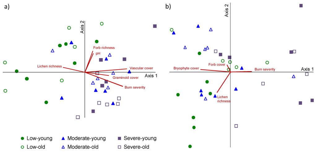Including only vascular vegetation in the ordination clearly separates the stand replacing moderate and high severity burns from the low severity burns and results in a main gradient defined by burn severity (A = 0.068, p < 0.001) and a secondary gradient associated with soil variables, but there was no difference among pre-fire stand age classes (A = −0.004, p = 0.645) (Figure 4a). When only non-vascular species are included in the ordination, high severity burns are clearly separated with burn severity again being the primary factor along Axis 1 (A = 0.045, p = 0.003), but there is no difference among pre-fire stand age classes (A = −0.003, p = 0.302) (Figure 4b). In this ordination, the secondary gradient is negatively correlated with greater lichen richness and positively with forb cover.
