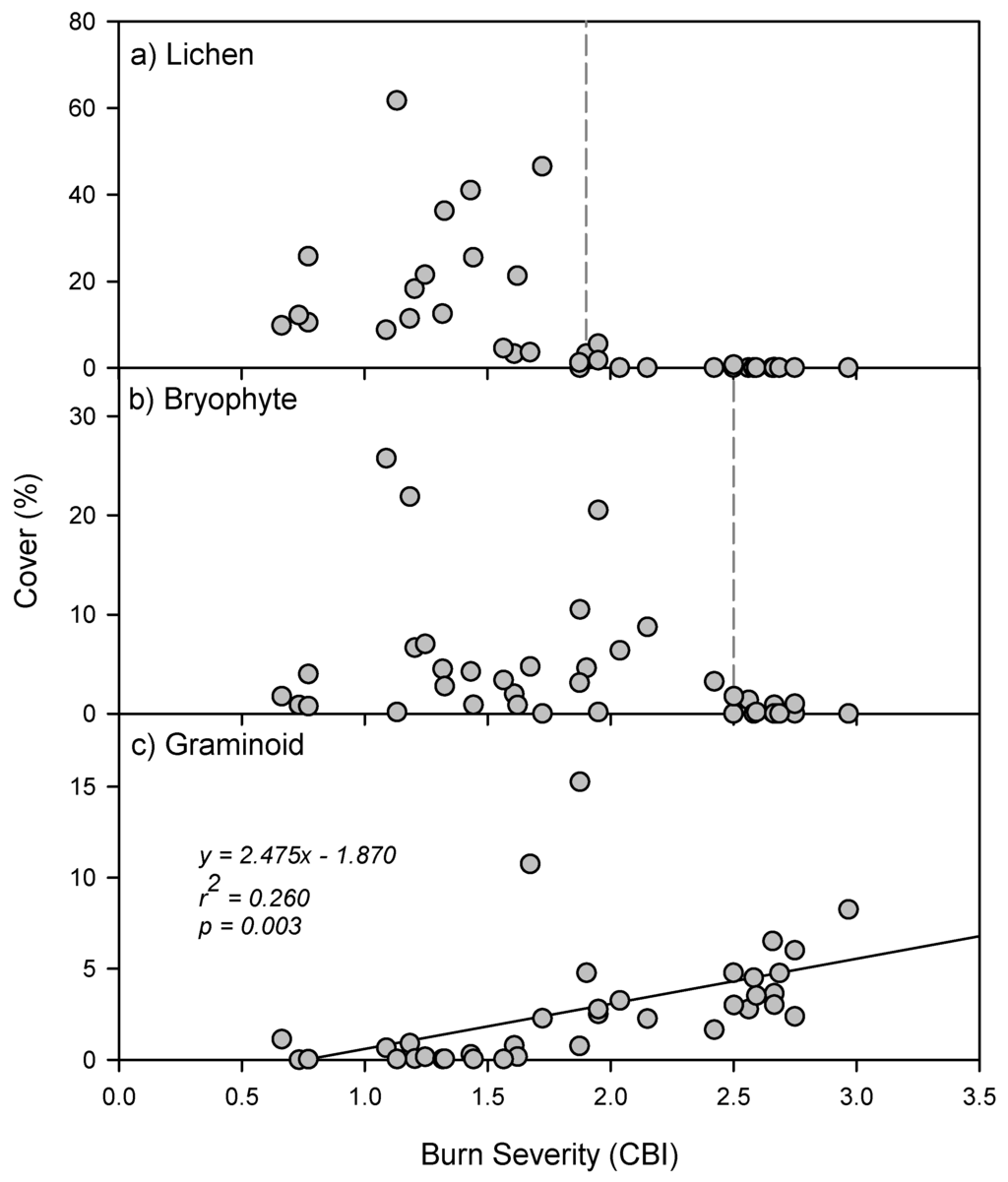 Relationships between the cover of plant groups and burn severity as measured by the Composite Burn Index (CBI) for (a) lichens, (b) bryophytes and (c) graminoids. The thresholds for lichen cover at 1.9 CBI and bryophyte cover at 2.5 CBI were determined from regression tree analysis at a significance level of p < 0.05.