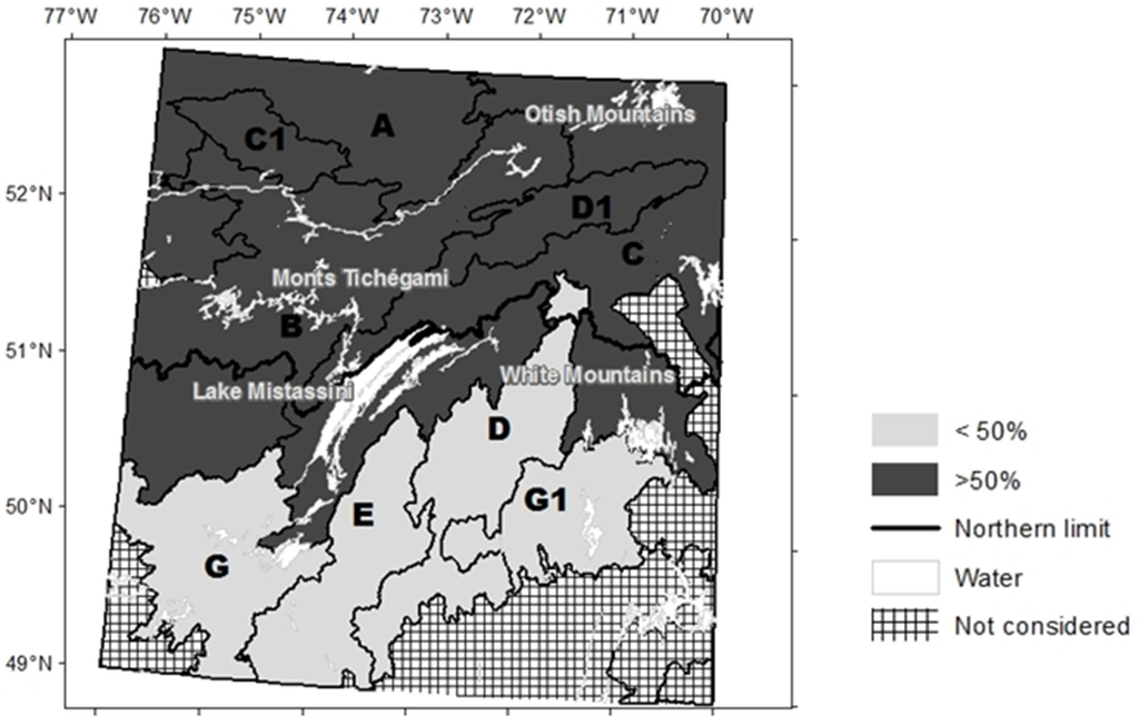 The study area can be divided into two zones according to the abundance of open stands observed in 2006 for each fire zone (Figure 2). Indeed, open stands are less abundant in areas located in the southern areas covered by the study (average abundance of less than 50% in D, E, G, and G1 areas), while they dominate the northern portions of the territory (A, B, C, C1, and D1 areas), precisely where the burn rate is higher (>0.3% year−1) (Figure 1). This division also coincides with a climatic transition zone with a colder climate zone in the north (A, B, C, C1, and D1 areas) and warmer in the south (D, E, G, and G1 areas) (Figure 1). The division between the two zones straddles the northern limit for timber allocations.