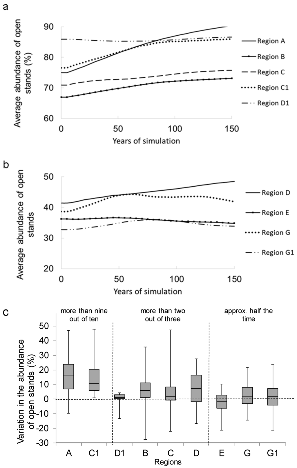 The increase in the abundance of open stands after 150 years of simulations is explained mainly by the total precipitation, the last day of frost and the burn rate (Table 1). The increase was more significant in the A and C1 areas, which are drier and/or cooler (total precipitation < 900 mm·year−1; average last day of frost > 170 Julian day), and/or when the burn rate is higher (>0.5% year−1). According to the simulation results (Figure 3c, Figure 7), the abundance of open stands increases in more than 90% of the simulations in the A and C1 areas and in more than two-third of the simulations in B, C, D, and D1 areas.