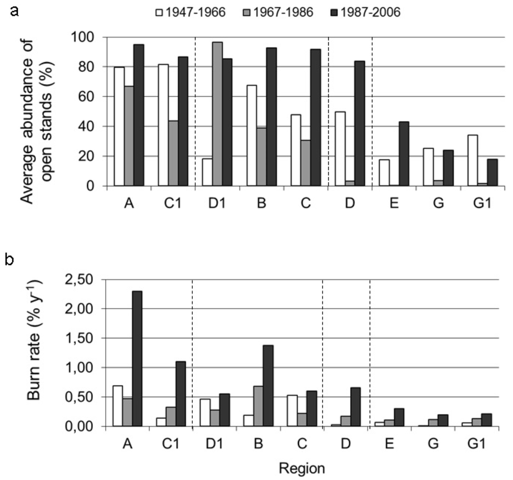 Average abundance of open stands by fire region for three 20-year periods (1947–1966, 1967–1986, and 1987–2006) (a); and corresponding regional burn rates by periods (b).