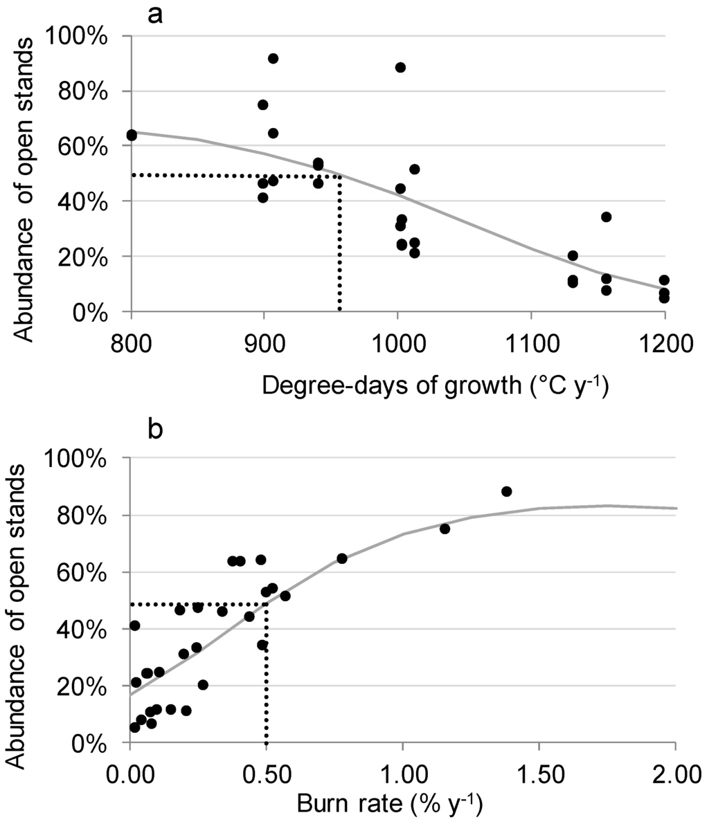 Relationship between the abundance of open stands by fire zone and degree-days of growth (a) and burn rate (b). Continuous lines refer to the logistic regression presented in Table 2.