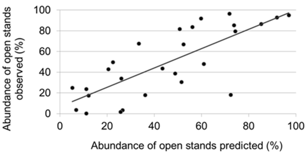 The abundance of open stands observed at the simulation start (2006) by fire zone is explained mainly by the number of degree-days and the average burn rate (Table 2). The abundance of open stands exceeds 50% when the degree-days of growth are lower than 1000 °C·year−1 or when the burn rate is above 0.5% year−1 (Figure 5). The logistic model explains 60% of the regional variation in the abundance of open stands (Figure 6).