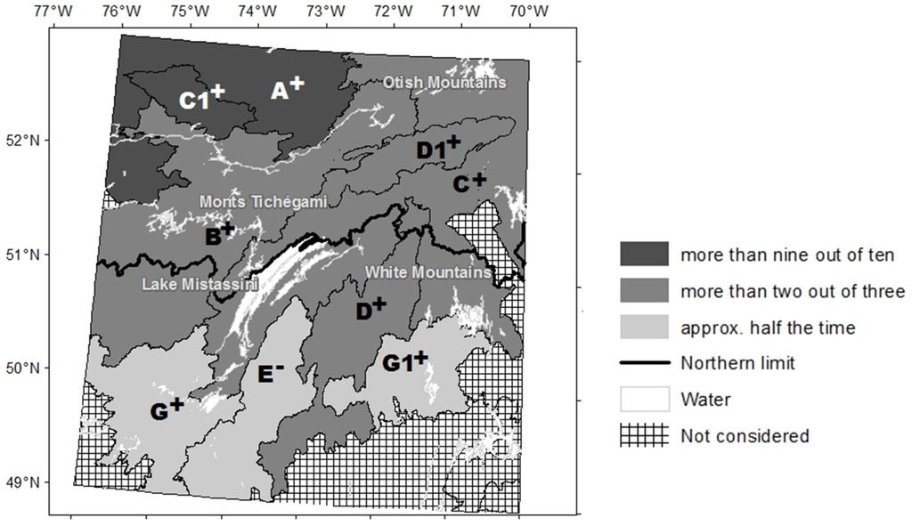This area straddles the northern limit for timber allocations as established by the Ministère des Forêts, de la Faune et des Parcs (MFFP) [35] in 2002. This northern limit more or less follows the 51st parallel (Figure 1). The forest data used in this study stem from two different inventory programs: the northern forest inventory program for the area above this limit, and the regular inventory program to the south. These two programs were homogenized in 2006 by the MFFP in order to generate forest maps that included surficial deposits, moisture regime, forest cover type (softwood, deciduous, or mixed), understory vegetation, cover density class, development stage, potential vegetation and disturbance of origin over an area of at least 8 ha [25,36]. South of the 51st parallel, forest maps were based on the interpretation of aerial photographs, which were taken between 1990 and 2001, and updated in 2006 by the MFFP to account for recent disturbances. North of the 51st parallel, forest vegetation was classified from satellite images (Landsat 2005), while aerial photographs at the scale of 1:40,000 were used to map surficial deposits and moisture regimes.