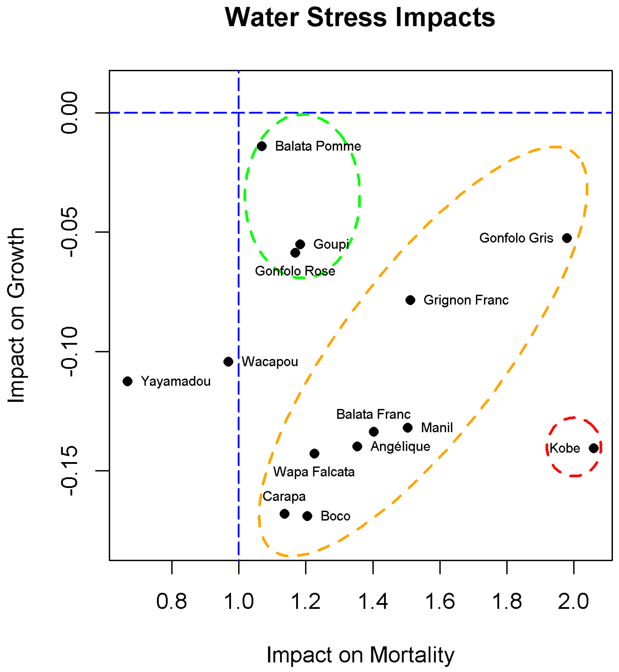 - Ouedraogo, D.; Mortier, F.; Gourlet-Fleury, S.; Freycon, V.; Picard, N. Slow-growing species cope best with drought: Evidence from long-term measurements in a tropical semi-deciduous moist forest of Central Africa. J. Ecol. 2013, 101, 1459–1470. [Google Scholar] [CrossRef]