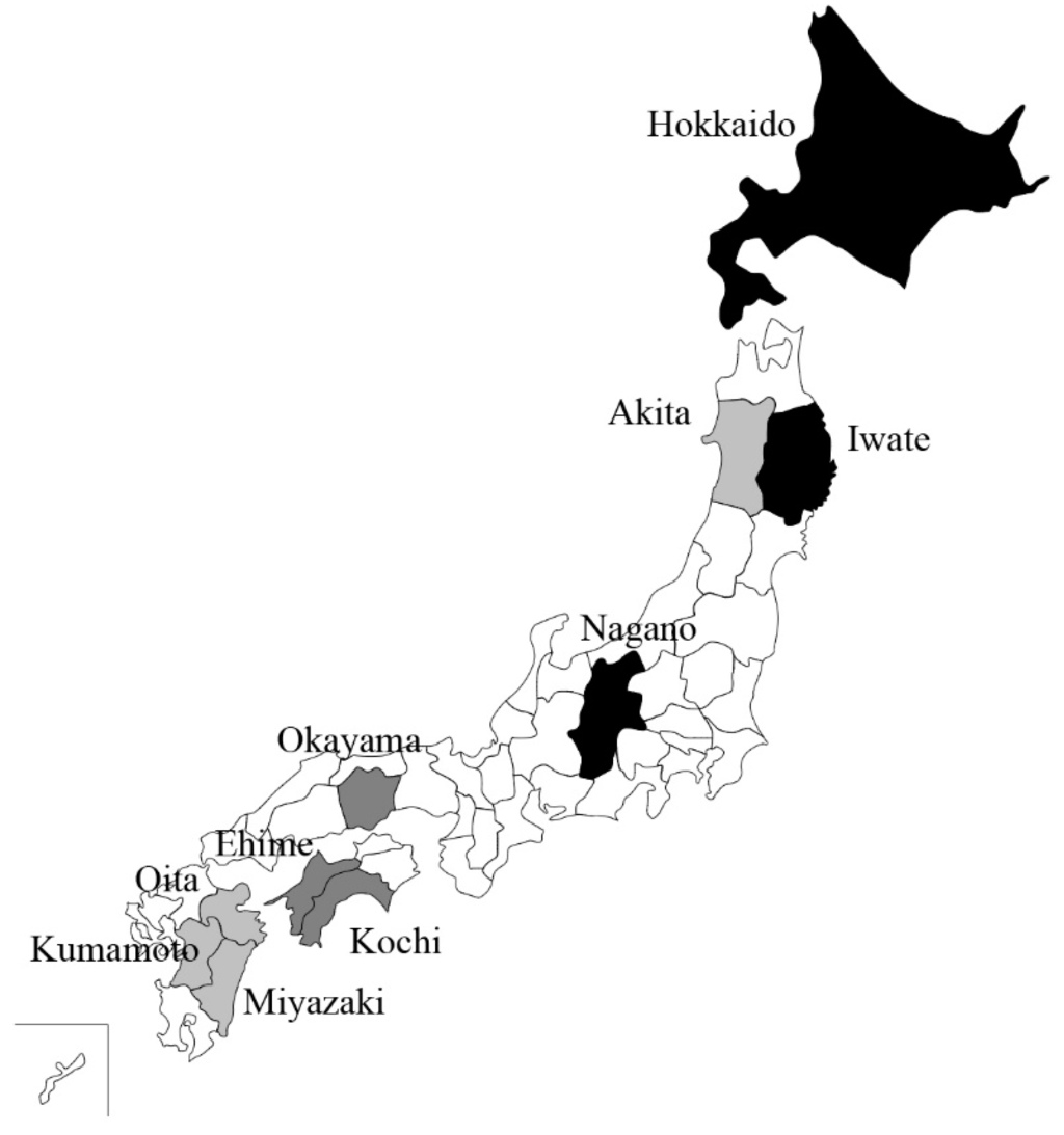 The top three species for log production in Japan—sugi, hinoki, and karamatsu—are mainly harvested from the planted forests. In 2014, the production volumes for these three species are 11.19 million m3 (56% of the total log production), 2.40 million m3 (12%), and 2.37 million m3 (12%), respectively [20]. The main prefectures for sugi production are Miyazaki, Akita, Oita, and Kumamoto; the top producers for hinoki are Okayama, Kochi, Ehime, and Kumamoto; and for karamatsu, they are Hokkaido, Iwate, and Nagano (see Figure 1). Sugi and hinoki sawnwood are mainly used in housing construction, and karamatsu sawnwood is mainly used as packaging materials for the storage and transportation of commodities.