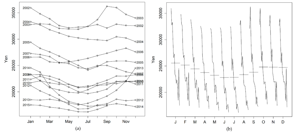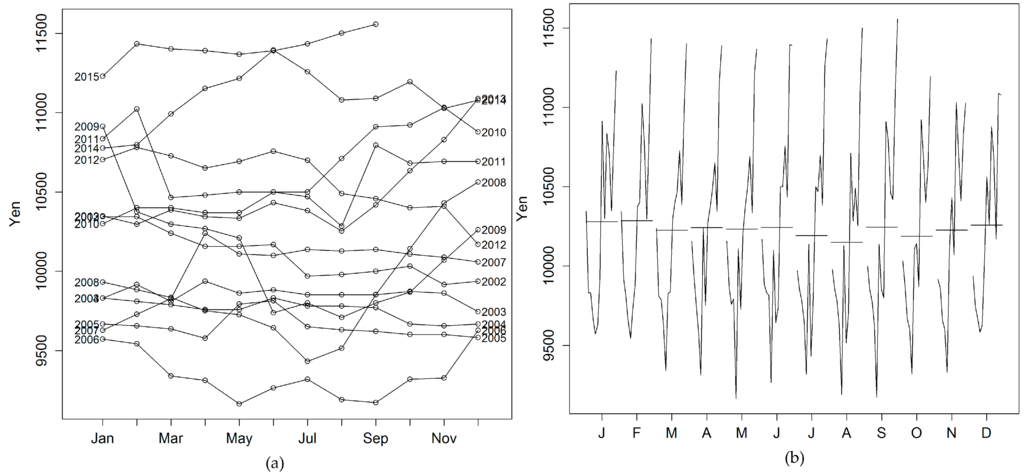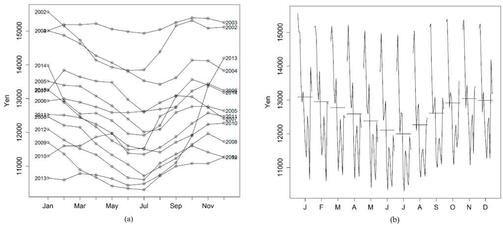 Annual and monthly karamatsu log prices: (a) Annual changes of karamatsu log prices against months; (b) monthly subseries of karamatsu log prices. The horizontal bars show the mean price for the monthly subseries, and polygonal lines show the changes over the years from 2002 to 2015.