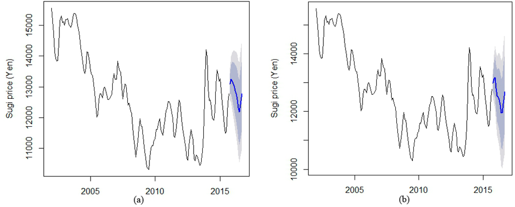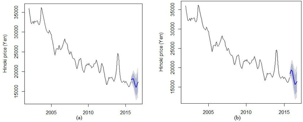 In using ets function in the package forecast under the R software environment, the results were shown in the form of (E, T, S), representing the error, trend and season components, respectively. The results for sugi, hinoki and karamatsu log prices are, respectively, (M, N, A), (M, Ad, A) and (M, N, N). All of these time series have multiplicative errors. Hinoki log price shows a damped trend, whereas sugi and karamatsu display no trend. As for the seasonality, the results show that sugi and hinoki experience additive seasonal movements in prices, but seasonal changes cannot be found in the karamatsu log price, which supports the aforementioned argument regarding seasonal characteristics. The smoothing parameters for sugi are α = 0.9999 and γ = 0.0001; for hinoki, they are α = 0.9999, β = 0.1412, γ = 0.0001, and ∅ = 0.8007; and for karamatsu, α = 0.9999. A high α value shows that time series values are highly affected by the previous value. A small γ value shows that the seasonal component does not change much over the years. Given that the expectation of error is zero, both the additive and multiplicative error methods gave the same forecasts but different forecast intervals.