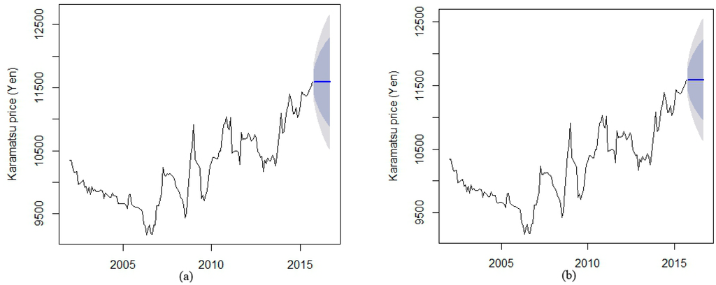 This research used univariate time series analysis for forecasting. Sometimes, structural time series models are useful for forecasting, as they incorporate terms of interest into the model, though one has to forecast or assume those terms first. In the case of forecasting price, however, it becomes complicated. According to economics theory, the price of a commodity is an endogenous variable that is determined by the relationship between supply and demand in the market. Price shifts with the changes in income, consumers’ preferences, cost of production elements, technological changes, prices of other related commodities, among other factors. Prices can be forecasted by taking these factors into account. For example, Organization of the Petroleum Exporting Countries (OPEC) quota, OPEC production, and industrial stock level of oil can be used to forecast short-term oil price [39]. However, there are not many empirical studies on price forecasting by using structural time series models, perhaps due to the difficulties in quantifying the related factors and those factors must be forecasted prior to forecasting prices. With univariate forecasting approaches, the only variable is log price in this research, which makes forecasting simple and sometimes useful. Of course, the ETS method simply decomposes a time series into trend, seasonal, and error components without taking other elements into account, such as cyclical movements. As for ARIMA models, it might be a good idea to add exogenous variables to the model [40,41]. Furthermore, it is also worthwhile to apply equilibrium, structural, and reduced form models in forecasting the prices of Japanese logs.