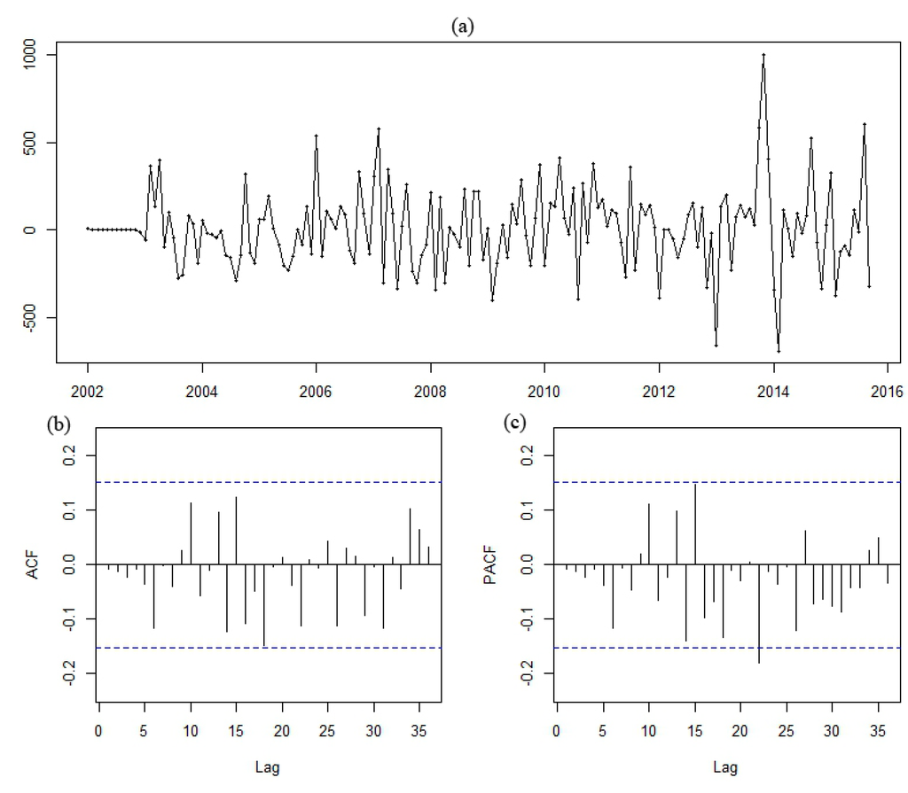 In this research, we first confirmed the situations of autocorrelation and partial autocorrelation in the time series, which was helpful in choosing the order of AR and MA. Then, we tested stationarity and determined the meaningful degrees of first differencing. We tried the possible orders of AR and MA and degree of integration. The best ARIMA models were selected according to their AICc statistics. However, we stopped at one degree of differencing the time series. Differencing twice makes it difficult to explain the economic meaning of the time series and leads to wider forecasting intervals. The unit root test was implemented to examine the stationarity of both the original time series and the differenced time series. Finally, a diagnostic check of the residuals in ARIMA models was conducted to justify model estimations.