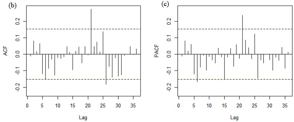 For the three ARIMA models, we first checked residuals’ correlations. Figure 8 shows residuals and their autocorrelations and partial autocorrelations with lags of up to 36 for the sugi log price. No pattern can be found in Figure 8a, though some irregular residuals existed. Figure 8b,c show that no significant correlations were confirmed. The situations for hinoki were similar. Figure 9 showed the analysis of the prices for karamatsu logs. Similarly, some irregular residuals were found in Figure 9a, but no pattern was confirmed. Two significant autocorrelations and partial correlations, respectively, were found by checking Figure 9b,c but most of them with a lag over 20. This result can be ignored by considering it an accidental result. We then implemented an ADF test, and the Dickey-Fuller results were −5.992, −5.360, and −6.283, respectively, for sugi, hinoki, and karamatsu. For all of the cases, p-value <0.01, which shows that they are stationary. Finally, we implemented the Box-Ljung test [38]. The results for sugi, hinoki, and karamatsu are χ2 = 22.660 (p-value = 0.540), 15.874 (p-value = 0.893), and 32.014 (p-value = 0.127), which means that these residuals were not distinguishable from a white noise series.