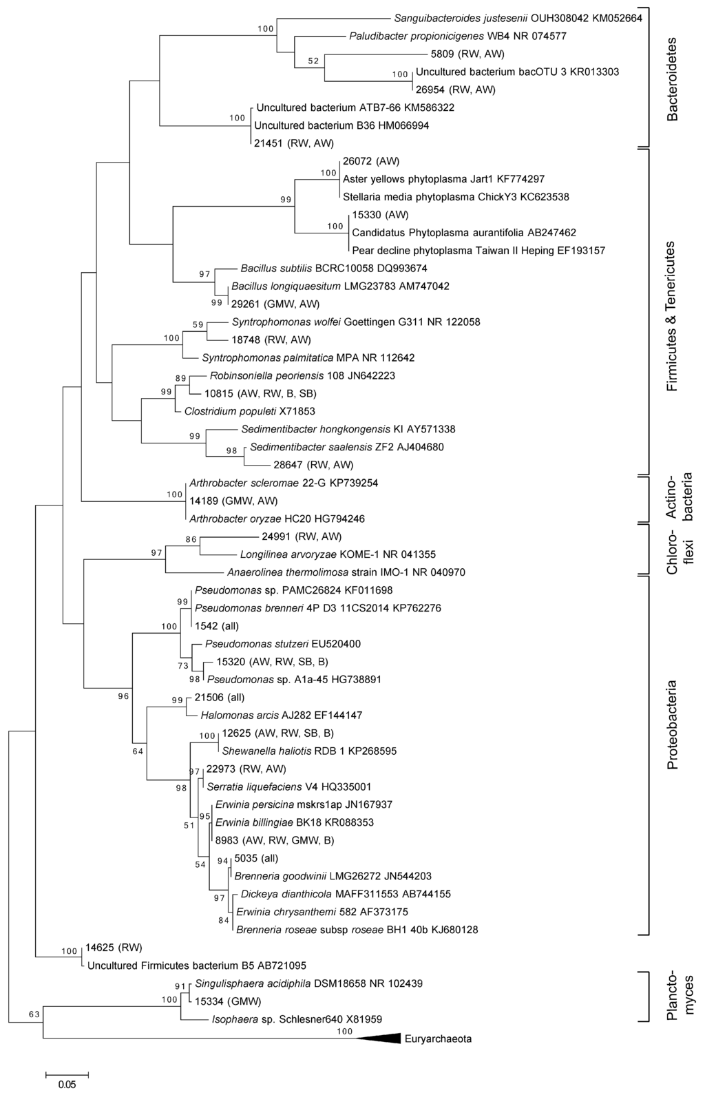 Phylogenetic tree of the 20 most abundant oak associated bacteria, irrespective of health status of the tissue. Bootstrap values above 50% are displayed. Sites where the OTUs were detected are indicated in brackets (Attingham Wood (AW), Runs Wood (RW), Great Monks Wood (GMW), Stratfield Brake (SB), Bisham (BW)).