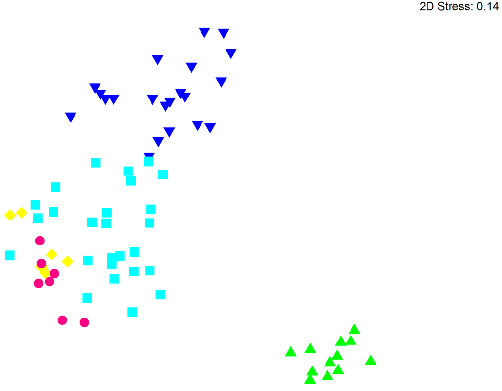 Differences in alpha (within sample) diversity were assessed by comparing the number of OTUs, chao1 richness estimator [] and phylogenetic diversity (PD, []) obtained for each sample based on the rarefied dataset. Relative abundances of OTUs clustered at 97% sequences similarity were used to assess differences between bacterial communities. Multivariate analysis of square root transformed community data was performed using the subroutines nonmetric multidimensional scaling (nMDS) and analysis of similarities (ANOSIM, []) based on Bray–Curtis similarities of the PRIMER software package version 7 (Primer-E Ltd., Lutton, UK). Clustering was applied using complete linkage mode. Phylogenetic analysis was performed by MEGA 6 [,] using alignment by ClustalW followed by the Maximum Likelihood method based on the Jukes-Cantor model.
