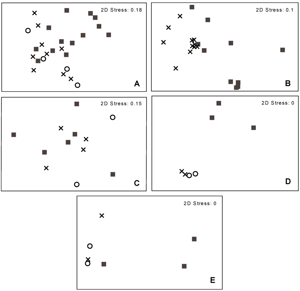 NMDS plot based on Bray–Curtis similarities of relative bacterial abundances after square root transformation in relation to the health status of the tissue sampled including all samples. Tissue health status was categorized as non-symptomatic tissues from trees with AOD (), symptomatic tissues from trees with AOD () and healthy tissue (). Displayed are the communities from the following sites: Attingham Wood (A); Runs Wood (B); Great Monks Wood (C); Stratfield Brake (D); Bisham Wood (E).