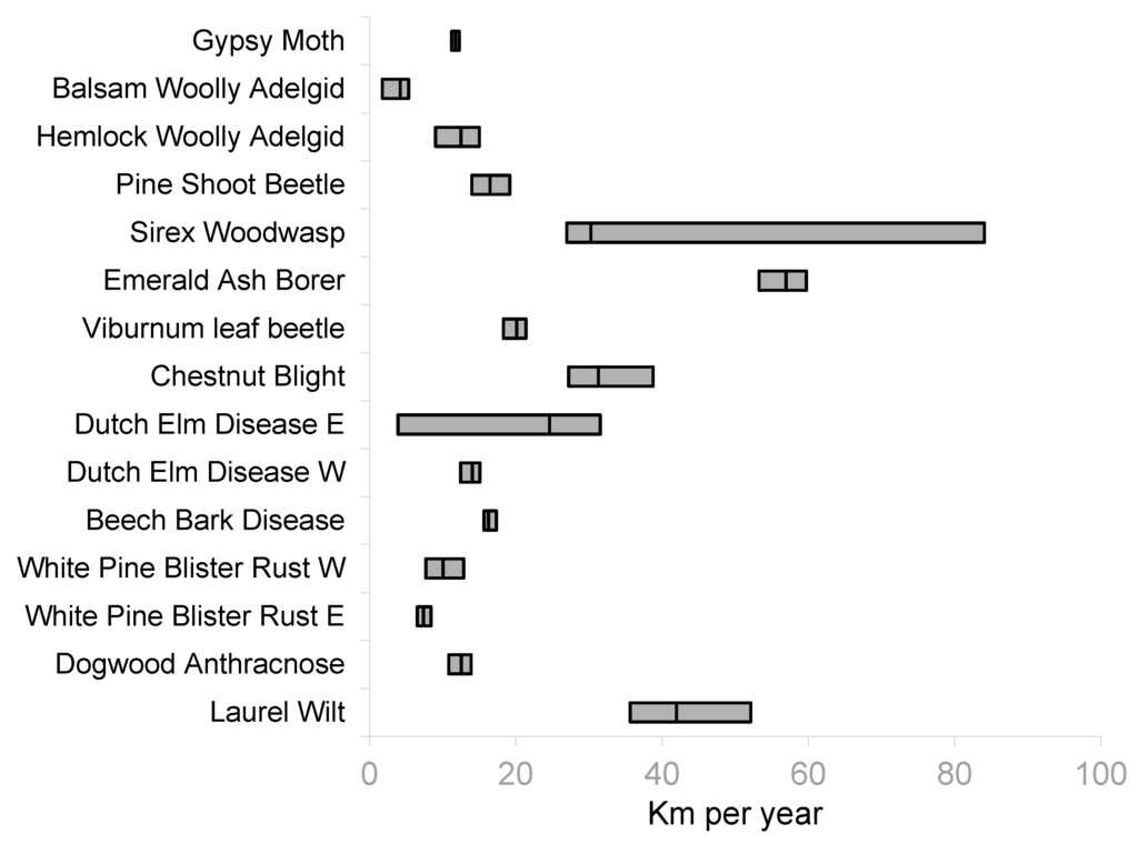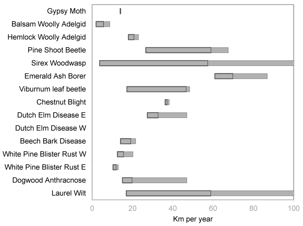 The median rate of spread for the 13 insects and diseases was 16.3 km·year−1. The range of spread rates is considerable with the fastest (EAB) spreading at a rate more than ten times the slowest (BWA). Even with this extensive database, comparison between the insects and diseases is difficult. The most obvious confounding factor is that a number of the diseases are vectored by insects. For example, DED is spread by bark beetles and an exotic ambrosia beetle is a vector for LW. The similarity in rates of spread may also be due to the lack of Allee effects in species such as HWA []. However, most of those species that rely on passive dispersal (BWA, HWA, DA, WPBR) have spread more slowly than those species that can fly long distances or are vectored by flying insects. CB is an exception to this pattern which may be due to ease of dispersal and the high density and contiguous distribution of its host throughout eastern forests.