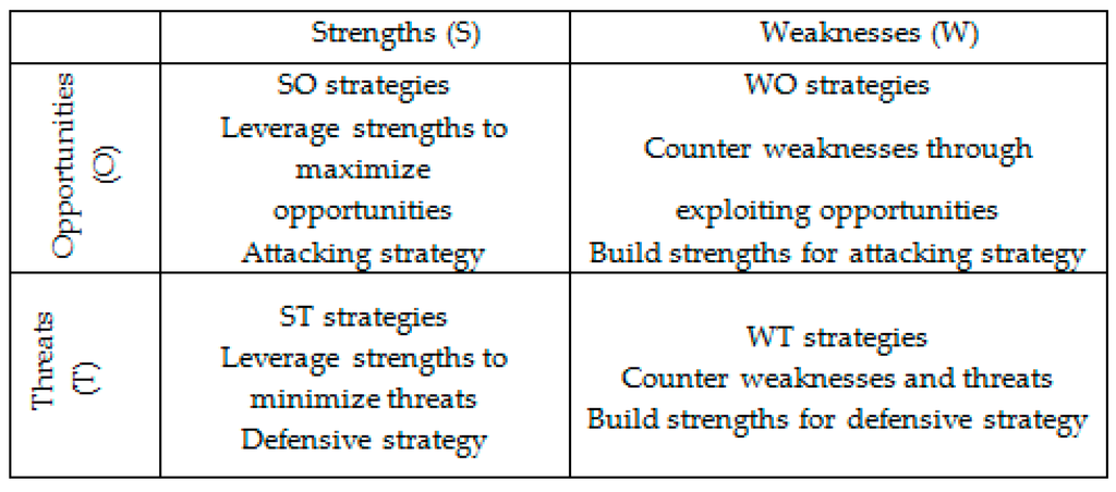 The TOWS matrix identifies various classes of strategies that follow on from a SWOT analysis: (1) those that link Strengths and Opportunities, SO Strategies for the attacking strategy; (2) those that link Weaknesses and Opportunities—this is potentially the most successful offensive strategy when it is appropriate to focus on innovation—WO Strategies to build strengths for the attacking strategy; (3) those that jointly focus on the Strengths and Threats—this is a strategy of alliance when investing in innovation through cooperation—ST strategies for a defensive strategy; (4) and those that arise from the joint assessment of Weaknesses and Threats—this is a defensive strategy, which will be invested in for supporting innovation strengths and eliminating risks—WT Strategies to build strengths for a defensive strategy, which is a strategy disinvestment when compromising changes are made, to minimise weaknesses and avoid risks []. Applying the TOWS matrix within the SWOT analysis identifies a general strategy, which will be modified for the conditions pertaining to the innovation strategy of contractor firms in the Slovak forestry service sector.