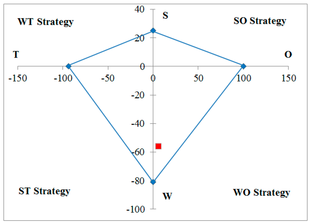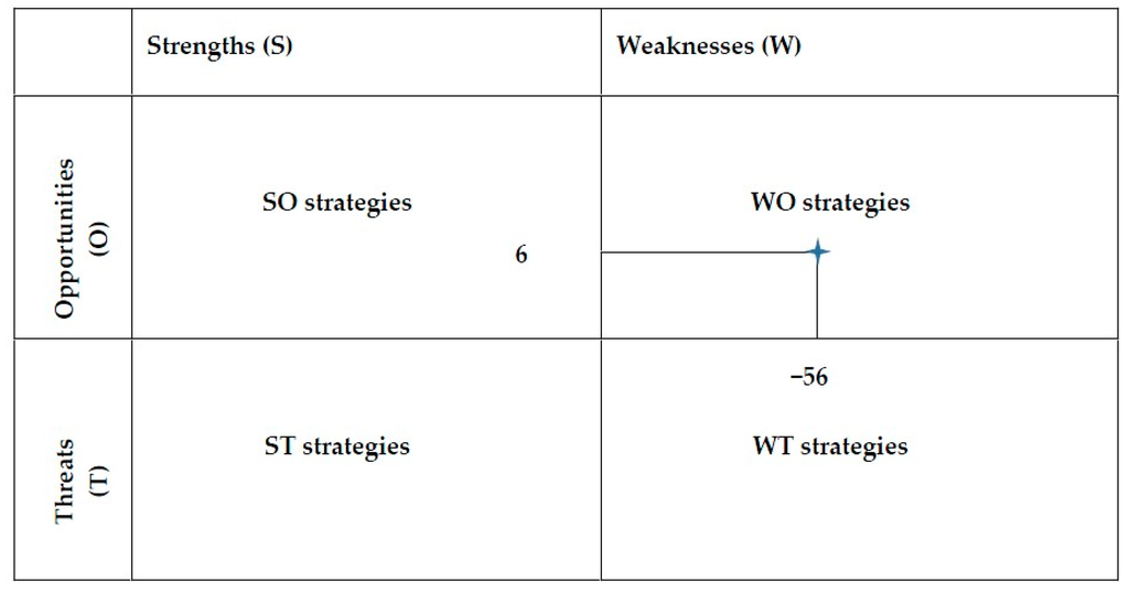 As indicated above, despite the number of risks that affect the implementation of innovations among the contractors in terms of their influence, they are less serious than the identified opportunities which outweigh the risks by 6% in the external environment, i.e., Opportunities-Threats = 100% − 94% = 6%. On the contrary, in the internal environment, weaknesses outweigh the strengths of innovations by 56%, i.e., Strengths-Weaknesses = 25% − 81% = −56%. The choice of the strategy can be determined by plotting the relationship between strengths and weaknesses as well as the opportunities and threats in the TOWS matrix (Figure 3).