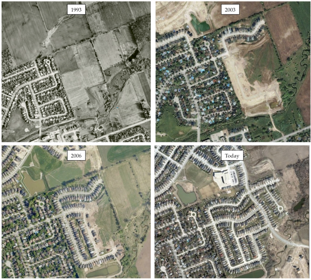 Aerial imagery showing the development of Stoney Creek (London, Ontario) from field to subdivision. Source: University of Western Ontario and Google Earth © DigitalGlobe.