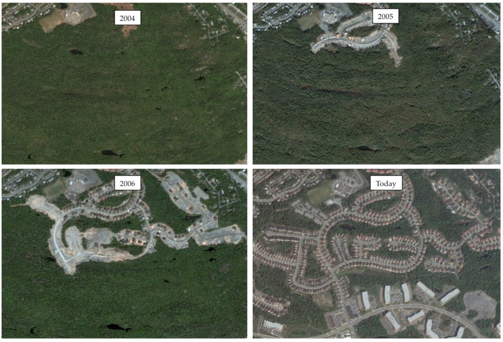 Aerial imagery showing the development of Millview (Halifax, Nova Scotia) from woodland to subdivision. Source: Google Earth © DigitalGlobe.