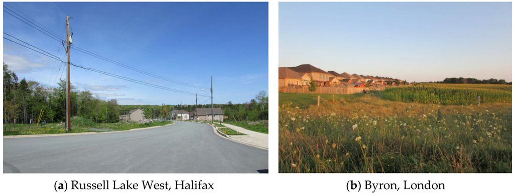 (a) An example of remnant woodland adjacent to a new subdivision development in Halifax; (b) An example of fields adjacent to a new subdivision development in London. Remnant stands in Halifax are generally found between property lines behind and beside housing developments as well as along pedestrian footpaths. In London, the scattered forest corridors that remain often exist further away from the development.