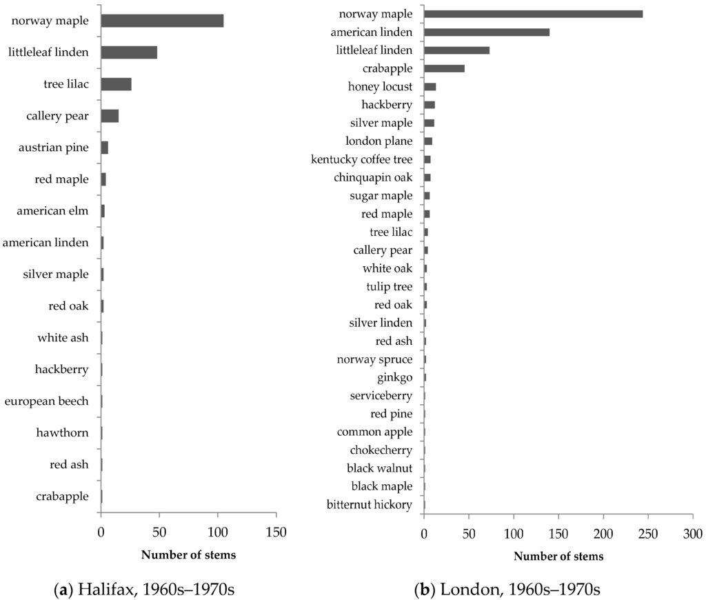 Combined relative species abundance of street trees in neighbourhoods developed 40–50 years ago: (a) Relative species abundance of street trees in two neighbourhoods in Halifax; (b) Relative species abundance of street trees in two neighbourhoods in London.